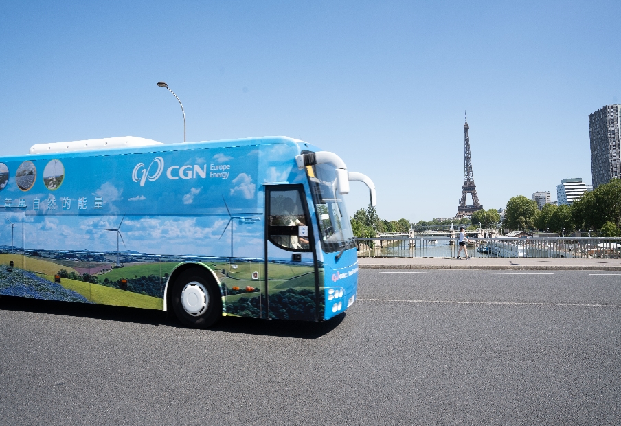 印有中廣核風(fēng)場(chǎng)的旅游大巴穿梭在巴黎街頭