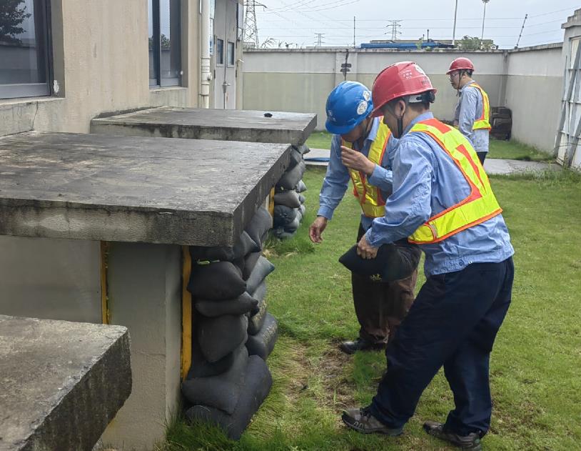 ▲上海電力長興燃機(jī)電廠一線員工在補(bǔ)給水泵房區(qū)域?qū)︼L(fēng)道口布置沙袋,確保防汛無死角。