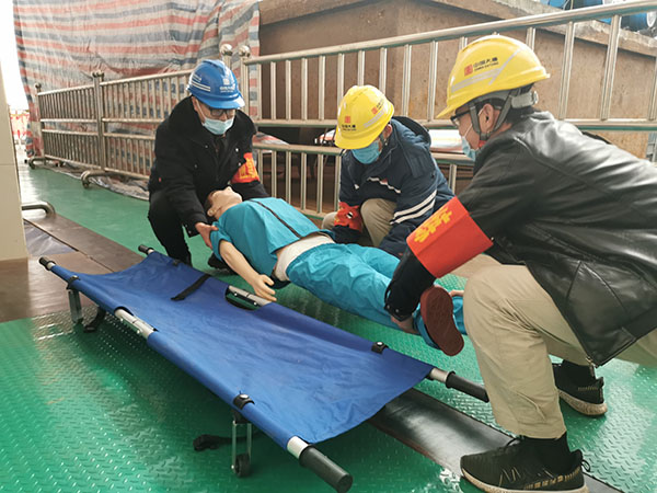此次演練在主安裝廠2號機組大修現場進行,模擬兩名施工人員在轉輪支架3米多高的平臺上焊接縫隙,一名工作人員未系安全帶進行作業(yè),不慎摔倒墜落。該公司相關部門接到報告后,迅速啟動應急機制,立即撥打120緊急電話,并通知應急救援隊趕赴事故現場。救援現場,應急隊員迅速判斷危險情況,并檢查傷員傷勢,大家齊心協(xié)力將傷員轉移到安全地帶,拉起警戒線,對傷員進行緊急檢查。救援人員發(fā)現傷者腿部骨折,無法行動,立即進行骨折包扎急救,按部就班、細致謹慎對傷口進行消毒、止血、固定、包扎。最后,傷員被順利送往醫(yī)院。