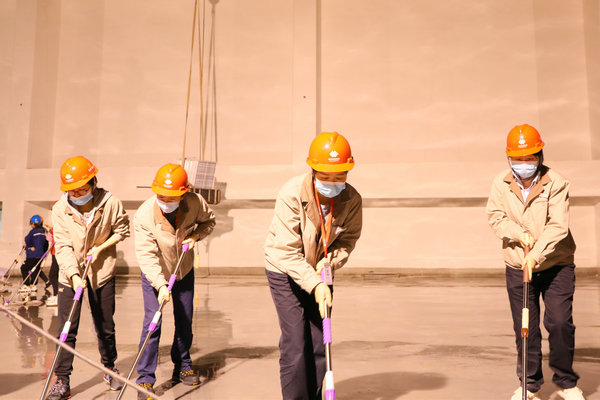 在到達(dá)位于汽機(jī)房17米平臺的GIS室后,女職工明確分工,協(xié)同配合,裝水、噴水、清掃、沖水、拖地……分區(qū)域、分小組地對GIS室地面進(jìn)行清潔。當(dāng)大家看著地面從塵土漫漫逐漸變成干凈整潔的地面,干凈的面龐已是塵土夾雜著汗水,臉上的笑容依舊如初,勞動的成就感,為工程建設(shè)作出力所能及貢獻(xiàn)的自豪感充溢著大家的內(nèi)心。經(jīng)過兩個多小時的勞動,順利完成了600平方米GIS室地面的清潔。