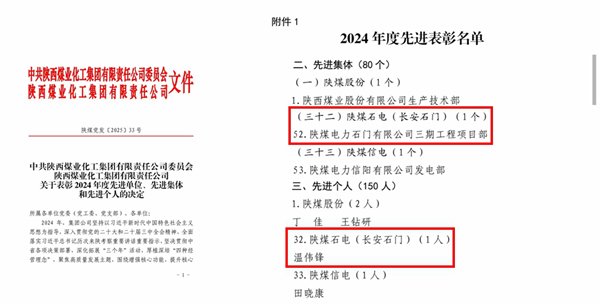 中國電力網(wǎng)訊 (通訊員石宣)2月11日,陜煤集團(tuán)召開三屆四次職代會暨2025年工作會,陜煤石門發(fā)電公司三期工程項(xiàng)目部榮獲陜煤集團(tuán)2024年度先進(jìn)集體,燃料運(yùn)輸部榮獲陜煤集團(tuán)2024年度安全環(huán)保先進(jìn)集體。溫偉鋒榮獲先進(jìn)個(gè)人榮譽(yù),羅少云榮獲安全環(huán)保先進(jìn)個(gè)人榮譽(yù)。