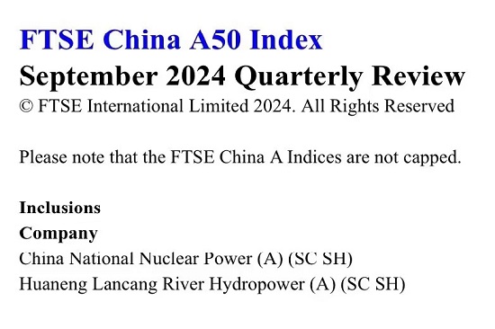 富時羅素(FTSE Russell)9月4日宣布對富時中國A50指數(shù)進(jìn)行季度審核變更,納入華能水電等兩只股票,本次變更于9月20日生效。在今年8月,華能水電股票也被納入明晟(MSCI)中國指數(shù)。