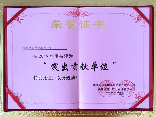 中國電力網(wǎng)訊 4月28日,南京市雨花經(jīng)濟(jì)開發(fā)區(qū)管委會(huì)婁杰書記一行四人,蒞臨南京華潤熱電有限公司并向公司授予雨花經(jīng)濟(jì)開發(fā)區(qū)2019年度“突出貢獻(xiàn)單位”獎(jiǎng)牌和證書,對(duì)公司2019年在開發(fā)區(qū)社會(huì)、經(jīng)濟(jì)發(fā)展等工作中做出的突出表現(xiàn)進(jìn)行表彰??偨?jīng)理丁建民代表公司領(lǐng)取了獎(jiǎng)牌。