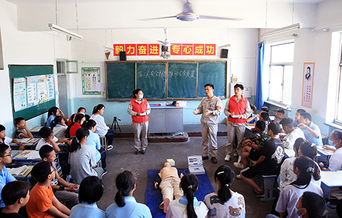 活動現(xiàn)場,青年志愿者給孩子們發(fā)放了安全環(huán)保宣傳手冊及宣傳單,給孩子們認真講解交通安全、消防滅火和生活中的安全防護知識,緊緊圍繞“落實安全責任、筑推動安全發(fā)展”主題,為孩子們進行“面對面、零距離、互動式”宣講、普及、解答有關應急救援知識。并借助橡皮人給孩子們培訓心肺復蘇急救知識,詳細講解操作流程和注意事項,指導孩子們親自上手操作實踐,提升孩子們的應急防護能力。該公司團委書記給孩子們講黨史、新中國史、改革開放史和社會主義發(fā)展史“四史”微團課,現(xiàn)場教孩子們學唱《強國一代有我在》愛國歌曲,鼓勵孩子們熱愛祖國、努力學習,砥礪奮進,勇敢追夢。