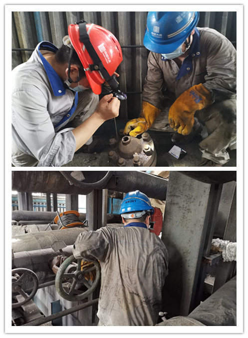 維護(hù)部:副主任與檢修人員一起檢查閥門損壞原因;綜合班副班長正在焊接3號機(jī)汽包加藥管逆止門