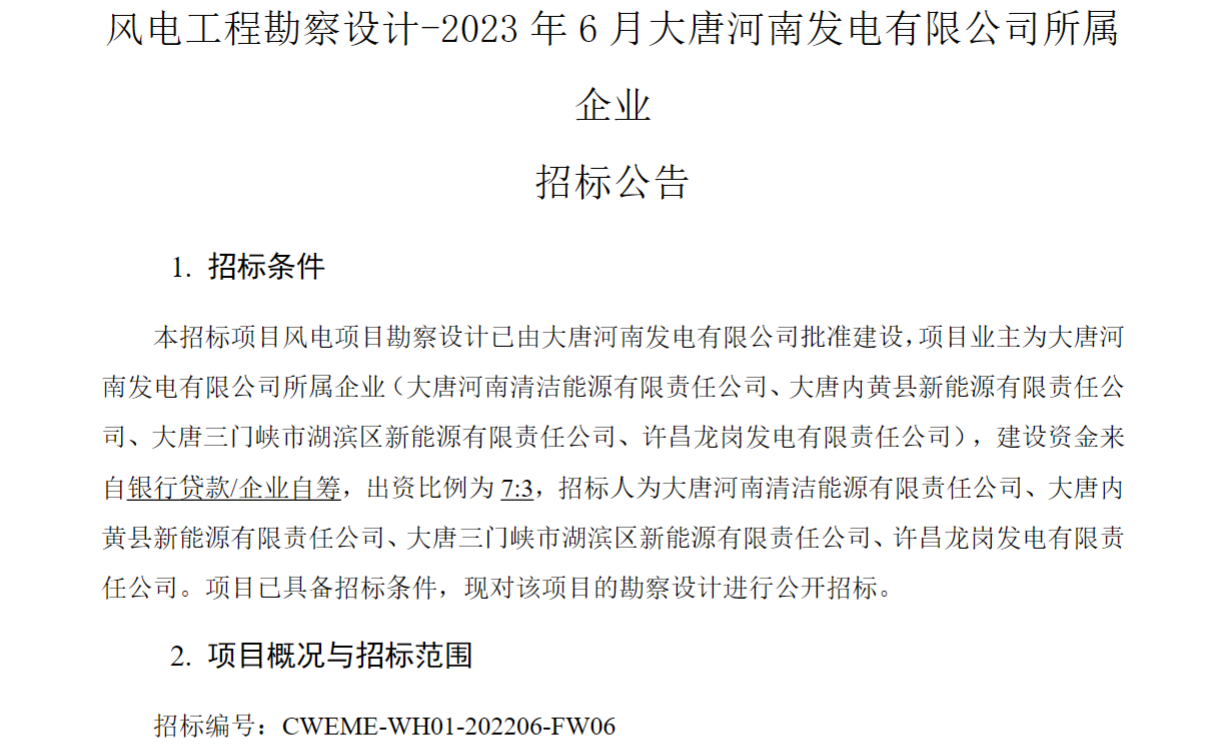 公告顯示,此次招標包括四個風電項目。