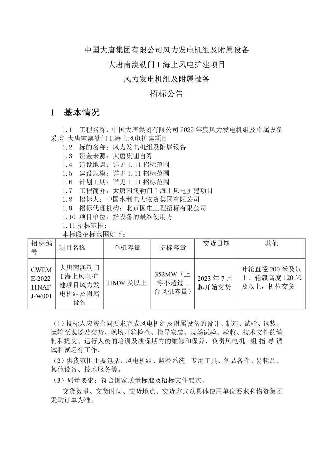 根據(jù)公告,此次招標(biāo)要求單機(jī)容量11MW及以上,葉輪直徑200米及以上,輪轂高度120米及以上,機(jī)位交貨。招標(biāo)容量352MW(上浮不超過1臺風(fēng)機(jī)容量)。交貨期定于2023年7月起。