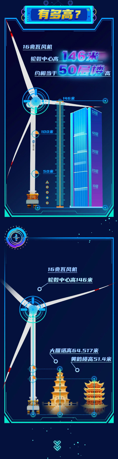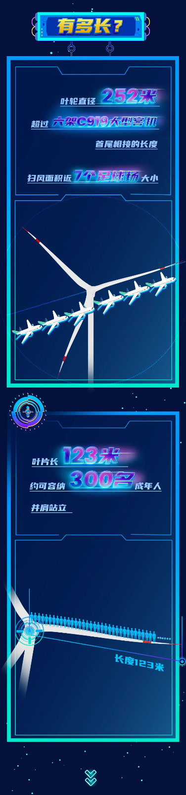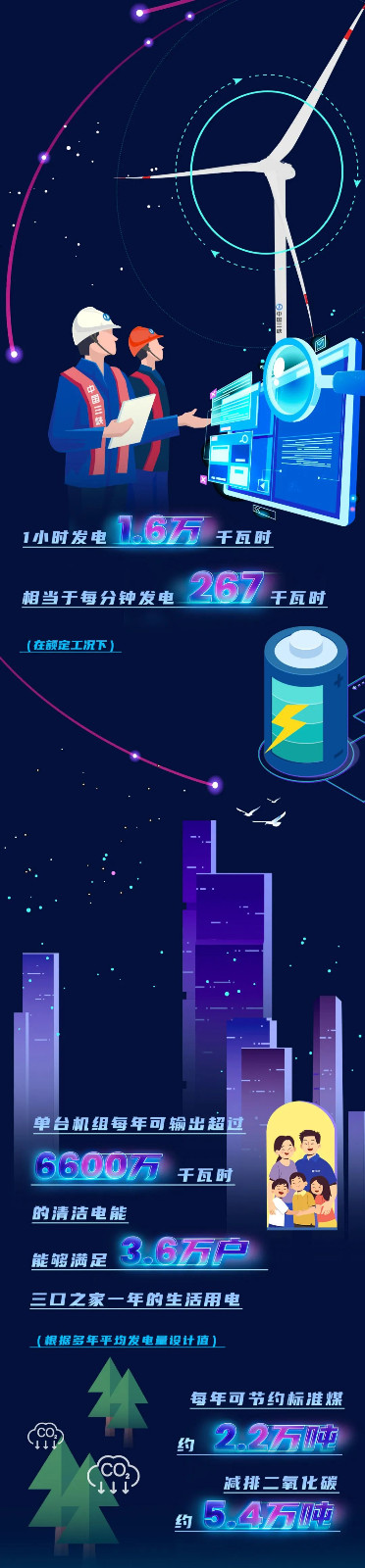 此次下線的單機(jī)容量16兆瓦海上風(fēng)電機(jī)組,葉輪直徑252米,葉輪掃風(fēng)面積約5萬平方米,約相當(dāng)于7個(gè)標(biāo)準(zhǔn)足球場大;輪轂高度達(dá)146米,約相當(dāng)于一座50層大樓的高度。在額定工況下,單臺(tái)機(jī)組每轉(zhuǎn)動(dòng)一圈可發(fā)電34.2千瓦時(shí)。根據(jù)多年平均發(fā)電量設(shè)計(jì)值,單臺(tái)機(jī)組每年可輸出超過6600萬千瓦時(shí)的清潔電能,能夠滿足3.6萬戶三口之家一年的生活用電,可節(jié)約標(biāo)煤約2.2萬噸,減排二氧化碳約5.4萬噸。