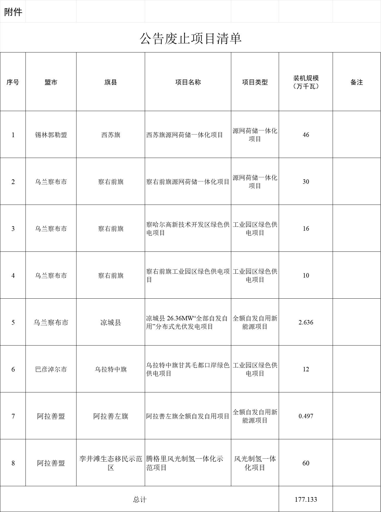 按照自治區(qū)黨委、政府工作要求,2023年11月起,自治區(qū)能源局組織開(kāi)展了全區(qū)新能源項(xiàng)目“再起底”工作,圍繞項(xiàng)目建設(shè)存在的問(wèn)題分類施策,督促和指導(dǎo)各盟市和有關(guān)企業(yè)加快項(xiàng)目建設(shè),同時(shí)全面實(shí)行市場(chǎng)化新能源項(xiàng)目“能進(jìn)、能出”機(jī)制,企業(yè)可隨時(shí)申報(bào)市場(chǎng)化并網(wǎng)新能源項(xiàng)目,也可隨時(shí)申請(qǐng)廢止已獲批但難以推進(jìn)的市場(chǎng)化并網(wǎng)新能源項(xiàng)目,避免無(wú)法實(shí)施的新能源項(xiàng)目圈占土地等資源。根據(jù)工作安排,現(xiàn)對(duì)2023年11月1日至2024年1月31日各盟市廢止的市場(chǎng)化并網(wǎng)新能源項(xiàng)目進(jìn)行公告。