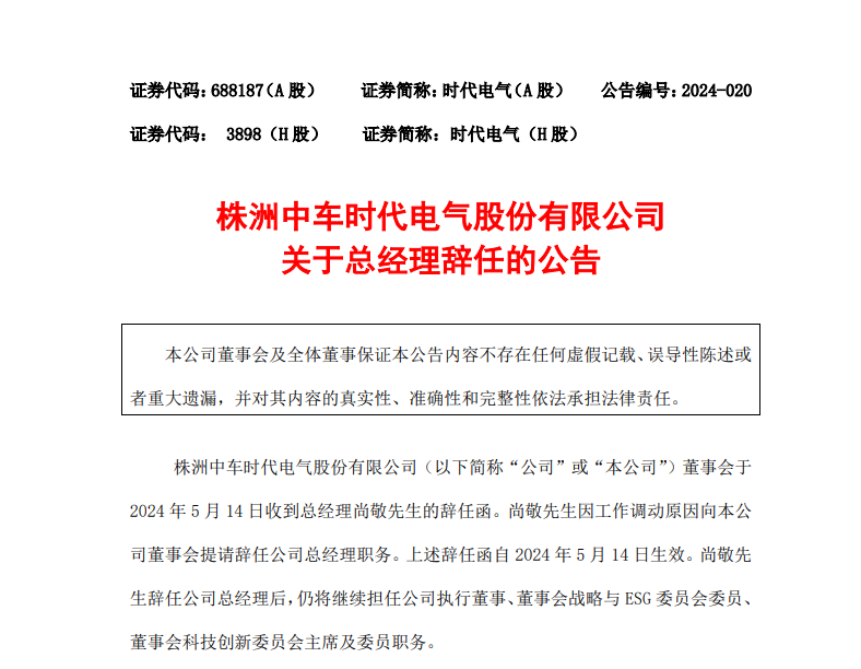 近日,A股上市公司時(shí)代電氣發(fā)布公告稱,其董事會(huì)已收到公司總經(jīng)理尚敬先生的辭任函。尚敬先生因工作調(diào)動(dòng)需要,向董事會(huì)提請(qǐng)辭去公司總經(jīng)理職務(wù)。公告還顯示,尚敬辭任公司總經(jīng)理后,仍將繼續(xù)擔(dān)任公司執(zhí)行董事、董事會(huì)戰(zhàn)略與ESG委員會(huì)委員等職務(wù)。