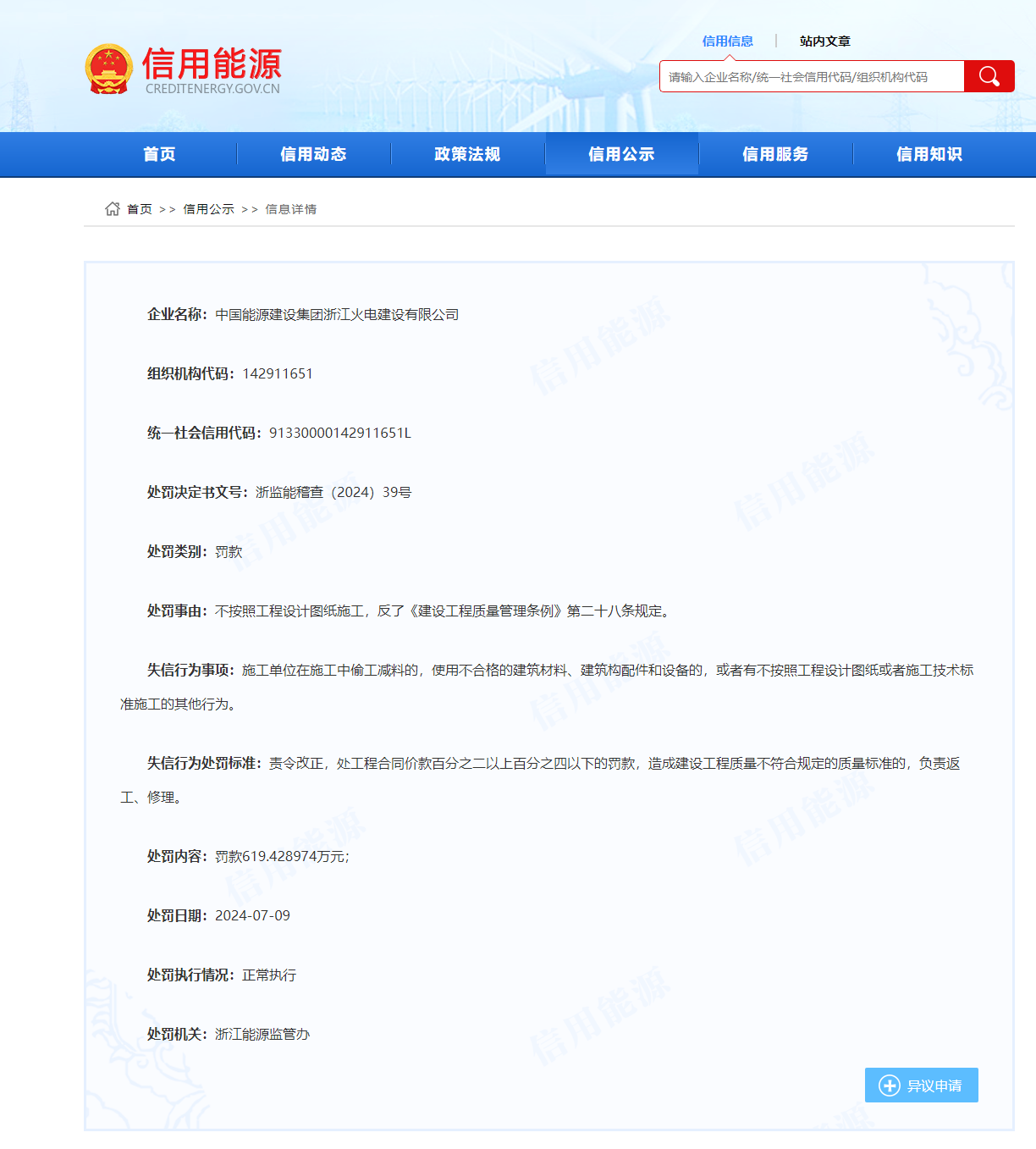 浙江能源監(jiān)管辦發(fā)布的《行政處罰決定書》(浙監(jiān)能稽查〔2024〕39號)中依據(jù)《建設(shè)工程質(zhì)量管理條例》(下稱“條例”)第六十四條對中國能建浙江火電處以了619萬余元的罰款。條例明確:施工單位在施工中偷工減料的,使用不合格的建筑材料、建筑構(gòu)配件和設(shè)備的,或者有不按照工程設(shè)計圖紙或者施工技術(shù)標準施工的其他行為的,責令改正,處工程合同價款百分之二以上百分之四以下的罰款;造成建設(shè)工程質(zhì)量不符合規(guī)定的質(zhì)量標準的,負責返工、修理,并賠償因此造成的損失;情節(jié)嚴重的,責令停業(yè)整頓,降低資質(zhì)等級或者吊銷資質(zhì)證書。