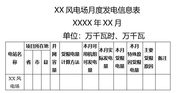 第十條 風電場發(fā)電數(shù)據(jù)報送以單個風電場為單元。各風電場于每月5日前將風電場上月月度發(fā)電信息表(附件1)報送至相應電力調度機構,同時在國家可再生能源信息管理平臺和全國新能源電力消納監(jiān)測預警平臺填報。