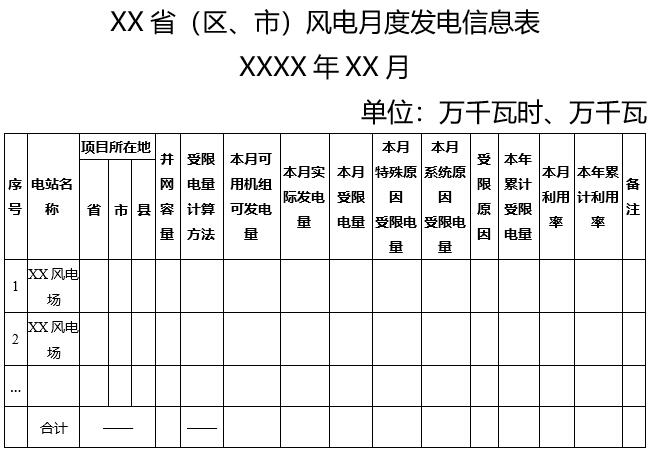 2. XX省(區(qū)、市)風電月度發(fā)電信息表