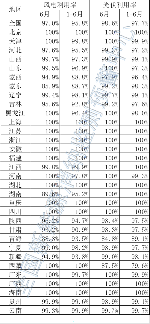 數(shù)據(jù)顯示,2022年6月,全國(guó)風(fēng)電、光伏的利用率分別為97%、98.6%;2022年1~6月,全國(guó)風(fēng)電、光伏的利用率分別為95.8%、97.7%。