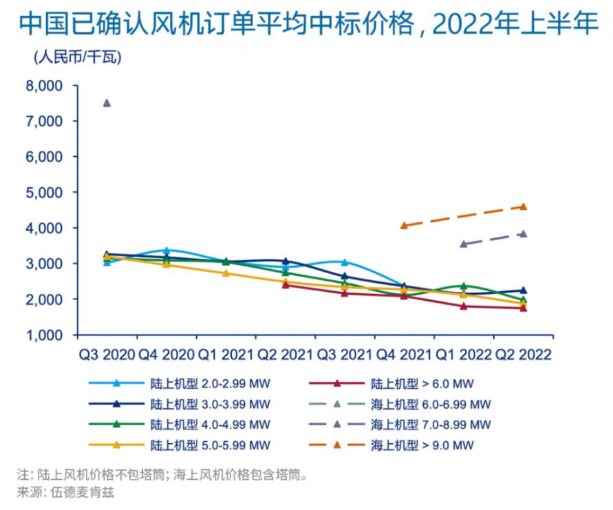 陸上風(fēng)機(jī)平均中標(biāo)價(jià)格在2022年第一季度再創(chuàng)新低。在首個(gè)7MW+陸上風(fēng)電機(jī)組的批量訂單中,出現(xiàn)了歷史最低中標(biāo)價(jià)格1408元/千瓦(不含塔筒)。雖然第二季度價(jià)格略有回升,但較2021年底水平仍下降了15%。新簽無補(bǔ)貼的海上項(xiàng)目與時(shí)間上最鄰近的有補(bǔ)貼的海上項(xiàng)目(2020年)相比,風(fēng)機(jī)平均中標(biāo)價(jià)格(含塔筒)下降了超過40%。大兆瓦機(jī)組的廣泛應(yīng)用,使中國(guó)風(fēng)電整機(jī)商能夠以較低的單位千瓦價(jià)格進(jìn)行投標(biāo)。例如,6MW陸上風(fēng)機(jī)的平均價(jià)格比3MW陸上風(fēng)機(jī)平均價(jià)格低22%。