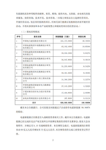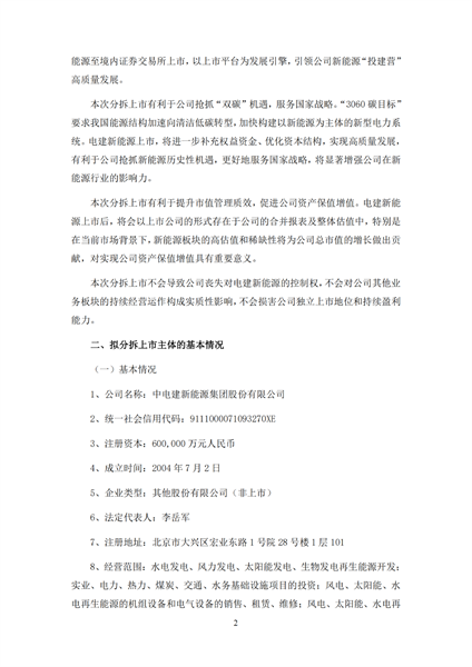 根據(jù)公告,擬拆分的中電建新能源集團股份有限公司注冊資本為60億元,經(jīng)營范圍包括水電發(fā)電、風(fēng)力發(fā)電、太陽能發(fā)電、生物發(fā)電再生能源開發(fā)等。目前,電建新能源正在推進(jìn)引入戰(zhàn)略投資者相關(guān)工作。