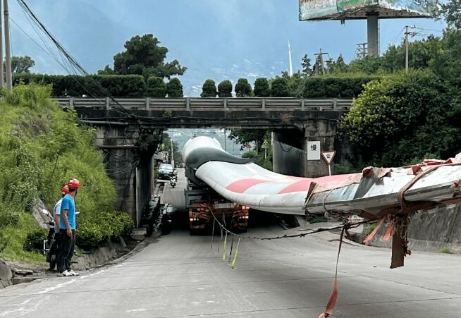 面對轉(zhuǎn)彎半徑嚴重不足、“卡脖子”橋洞兩道坎,運輸團隊積極與地方政府溝通,提前將“90度分道”拓建為弧形彎道,解決運輸車轉(zhuǎn)彎半徑不夠的難題。同時,提前進行實地勘測,精確測算過橋洞時葉根、葉尖與橋洞的距離,進一步調(diào)整運輸工裝的高度及葉片運輸姿態(tài),從而保障了B973A型葉片順利通過橋洞。