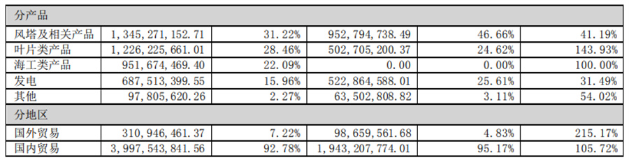 1、塔筒業(yè)務(wù)(含其他海上風(fēng)電及海洋工程裝備) 公司主營(yíng)風(fēng)力發(fā)電機(jī)組塔筒等陸上與海上風(fēng)力發(fā)電裝備及海洋工程裝備制造、銷(xiāo)售等業(yè)務(wù)。風(fēng)力發(fā)電設(shè)備業(yè)務(wù)方面, 主要產(chǎn)品為自主品牌的陸上風(fēng)電塔筒和海上風(fēng)電塔筒、導(dǎo)管架、管樁、升壓站平臺(tái)及相關(guān)輔件、零件,是陸上及海上風(fēng) 力發(fā)電機(jī)組的主要部件之一,主要起支撐作用。海洋工程設(shè)備業(yè)務(wù)方面,主要產(chǎn)品為海洋工程平臺(tái)相關(guān)輔件、零件以及 用于海洋工程的各類(lèi)鋼結(jié)構(gòu)件,相關(guān)產(chǎn)品作用涵蓋海洋工程的各個(gè)方面,視具體訂單而有所不同。上述業(yè)務(wù)經(jīng)營(yíng)模式主 要是以銷(xiāo)定產(chǎn),主要業(yè)績(jī)驅(qū)動(dòng)因素為國(guó)家相關(guān)產(chǎn)業(yè)及行業(yè)政策、銷(xiāo)售價(jià)格、原材料價(jià)格、收入確認(rèn)項(xiàng)目數(shù)量、應(yīng)收款回 款、人民幣匯率波動(dòng)等。