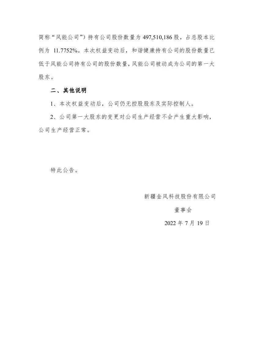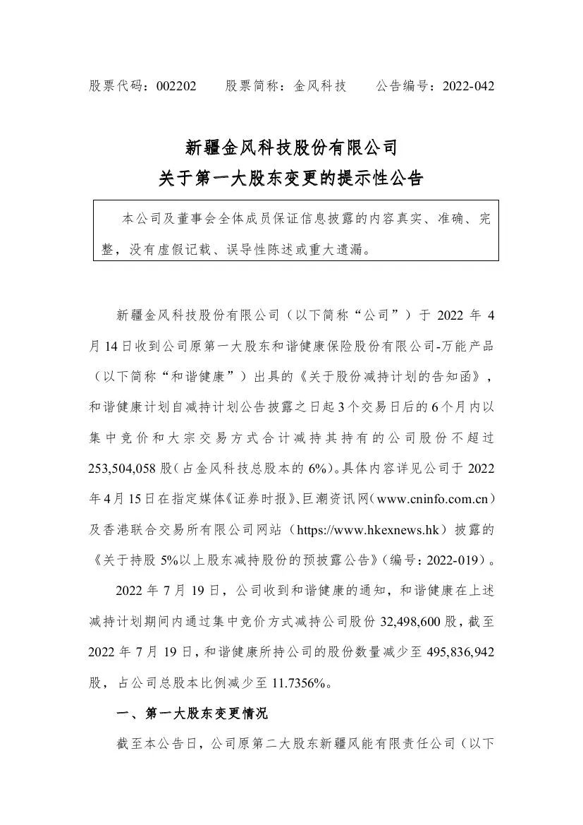 金風(fēng)科技日前發(fā)布《關(guān)于第一大股東變更的提示性公告》。截至2022年7月19日,公司原第一大股東和諧健康保險(xiǎn)股份有限公司-萬(wàn)能產(chǎn)品(簡(jiǎn)稱“和諧健康”)所持公司的股份數(shù)量占總股本比例減少至11.7356%,原第二大股東新疆風(fēng)能有限責(zé)任公司(簡(jiǎn)稱“風(fēng)能公司”)被動(dòng)成為公司的第一大股東。