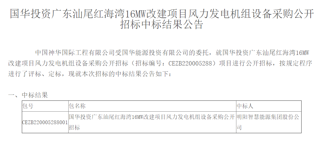 日前,國華投資廣東汕尾紅海灣16MW改建項(xiàng)目風(fēng)力發(fā)電機(jī)組設(shè)備采購公開招標(biāo)結(jié)果,明陽智能成功中標(biāo);國華投資國華(汕尾)風(fēng)電有限公司紅海灣風(fēng)電場項(xiàng)目EPC總承包工程公開招標(biāo)結(jié)果,明陽智能旗下潤陽能源技術(shù)有限公司(簡稱:潤陽能源)全資子公司天津明智潤陽技術(shù)有限公司成功中標(biāo)。