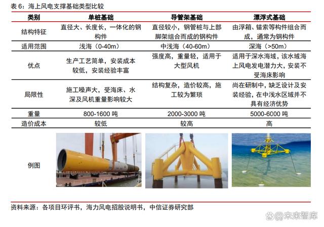 海風(fēng)項(xiàng)目仍以單樁、多樁為主流,導(dǎo)管架和漂浮式基礎(chǔ)長(zhǎng)期發(fā)展趨勢(shì)樂(lè)觀。目前國(guó)內(nèi) 已裝機(jī)海風(fēng)項(xiàng)目水深多在 15-20m,淺海海床較軟,基本采用單樁基礎(chǔ)結(jié)構(gòu),導(dǎo)管架目前 只應(yīng)用于海洋地質(zhì)環(huán)境復(fù)雜的廣東、福建兩省的部分海風(fēng)項(xiàng)目中,漂浮式基礎(chǔ)用于超過(guò) 50m 的深遠(yuǎn)海域,因施工難度大、整體成本高、技術(shù)不成熟等原因,還未運(yùn)用到商業(yè)化中。 2022 年以來(lái)招標(biāo)項(xiàng)目平均水深提至 30m,隨著項(xiàng)目水深的持續(xù)增大,有望帶動(dòng)水下基礎(chǔ) 由單樁向?qū)Ч芗苌?jí),進(jìn)而提升樁基的價(jià)值量和重量。