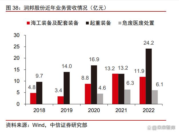 業(yè)務線豐富,布局高端裝備和環(huán)保板塊。公司主營業(yè)務分為包括海風裝備、物料搬運 裝備的高端裝備業(yè)務和包含危廢及醫(yī)廢處理處置服務的環(huán)保業(yè)務。2022 年公司海風裝備、 起重裝備、危廢醫(yī)廢處置業(yè)務分別營收 11.89、24.17、6.07 億元,占比 22.97%、46.71%、 11.73%。公司海上風電裝備業(yè)務主要產(chǎn)品包括各類海上風電基礎樁、導管架、海上風電安 裝作業(yè)平臺、海洋工程起重機等。