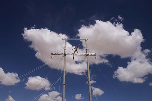 項目架空線路桿塔共計668基,12種桿塔型式。桿塔是在35kV架空線路架設(shè),線路總長度約122.21km,塔高為15-21米,屬于高空作業(yè)。施工現(xiàn)場干旱炎熱,沙塵暴和冰雹也常常輪番“光顧”,給施工進度和安全管理帶來不小的挑戰(zhàn)。在桿塔組立作業(yè)前,項目部組織協(xié)作隊伍召開專題安全會,施工隊長徐少帥堅持對現(xiàn)場的施工操作人員進行詳細的安全、技術(shù)、質(zhì)量交底工作;質(zhì)量安全科林周彬堅持每天現(xiàn)場巡查,要求高空作業(yè)人員必須持證上崗,且具有合格的體檢報告;施工過程中,施工現(xiàn)場拉起安全警戒線、懸掛安全警示標識,安全員全程旁站監(jiān)督,確保現(xiàn)場施工安全質(zhì)量可控。