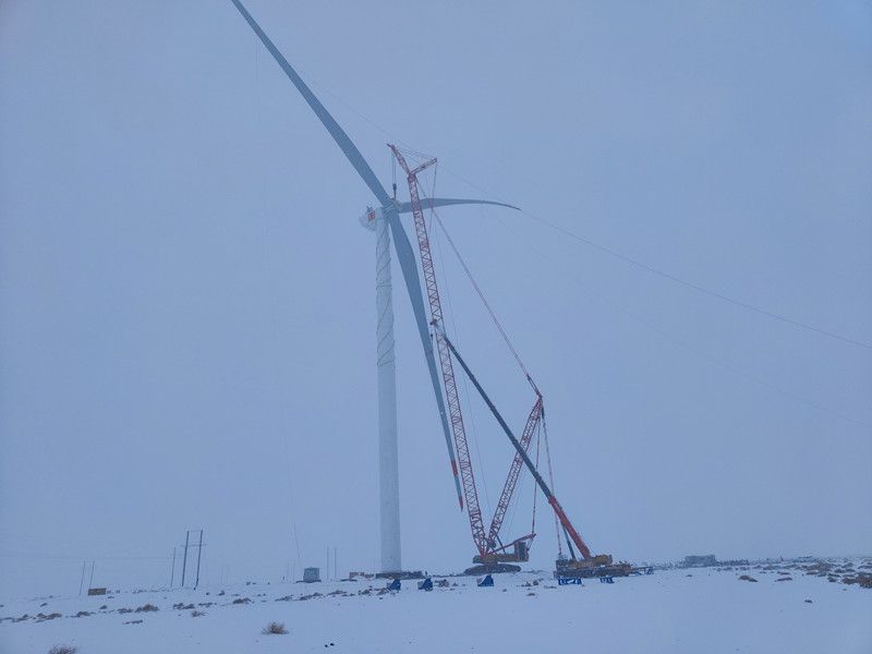 11月27日,在最后一臺(tái)風(fēng)機(jī)的吊裝現(xiàn)場(chǎng),面對(duì)施工環(huán)境的變化和溫度驟降,現(xiàn)場(chǎng)的吊裝工作人員顯得格外謹(jǐn)慎,伴隨著對(duì)講機(jī)中不斷傳來(lái)的指令,主吊司機(jī)小心翼翼?yè)軇?dòng)著操縱桿,司索工有的放矢牽引著纜風(fēng)繩,安裝工井然有序,所有人不懼嚴(yán)寒堅(jiān)守在各自崗位上,將巨大的風(fēng)機(jī)葉輪緩緩吊起;到達(dá)指定高度后,原本平行的葉輪逐漸轉(zhuǎn)為垂直并緩慢地向主機(jī)艙靠近;經(jīng)過(guò)多次精準(zhǔn)的調(diào)整,風(fēng)機(jī)葉輪終于與主機(jī)實(shí)現(xiàn)完美對(duì)接……吊裝團(tuán)隊(duì)在經(jīng)歷了50多個(gè)小時(shí)的緊張作業(yè)后,風(fēng)機(jī)像一位全副武裝的鋼鐵巨人張開(kāi)臂膀屹立在天地之間,在隨風(fēng)飄蕩的雪花和不遠(yuǎn)處其他小型風(fēng)機(jī)的襯托下,更顯現(xiàn)出它的挺拔宏偉。