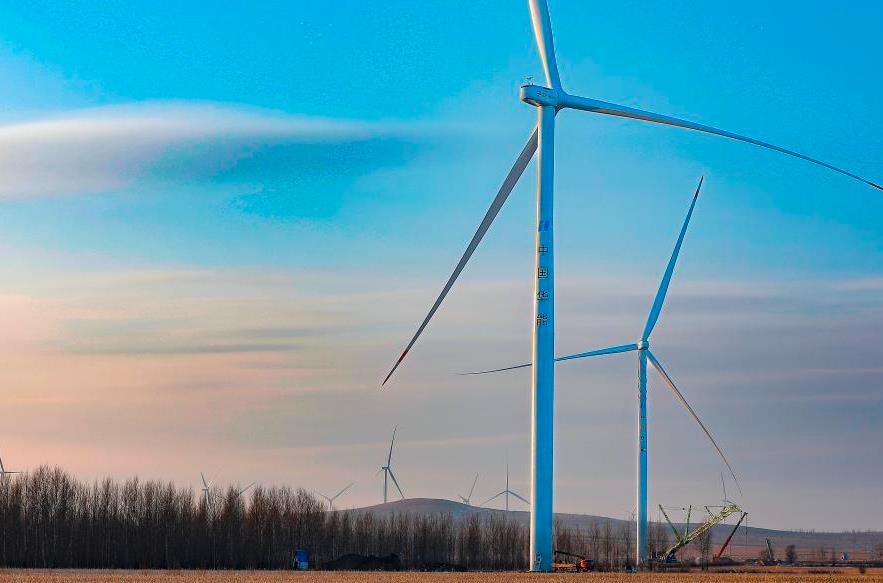 2022年12月27日,施工人員在華能突泉30萬千瓦風電項目建設(shè)現(xiàn)場吊裝最后一臺風電組件。