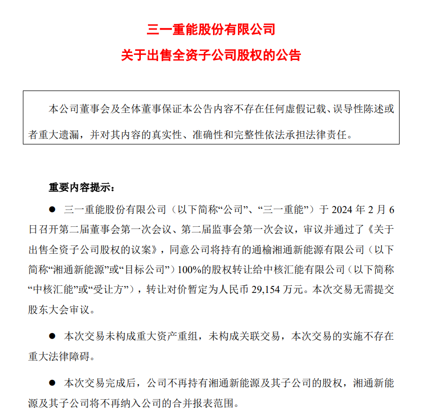 公告披露,公司將持有的通榆湘通新能源有限公司(簡稱“湘通新能源”)100%的股權(quán)轉(zhuǎn)讓給中核匯能有限公司,轉(zhuǎn)讓對(duì)價(jià)暫定為2.92億元。