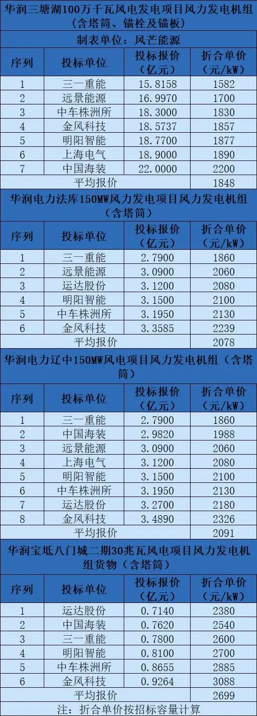 10月11日,華潤(rùn)4個(gè)風(fēng)機(jī)采購(gòu)項(xiàng)目共計(jì)1.33GW開(kāi)標(biāo)。其中,華潤(rùn)三塘湖1GW風(fēng)機(jī)(含塔筒、錨栓)采購(gòu)項(xiàng)目共有7家整機(jī)商競(jìng)標(biāo),最高投標(biāo)報(bào)價(jià)22億元,折合單位2200元/kW;最低投標(biāo)報(bào)價(jià)為15.8158億元,折合單價(jià)為1582元/kW。減去塔筒、錨栓價(jià)格(按輕量化,保守350元/kW來(lái)算),最低報(bào)價(jià)裸機(jī)價(jià)格僅約1232元/kW。該報(bào)價(jià)為風(fēng)機(jī)價(jià)格歷史最低點(diǎn)。