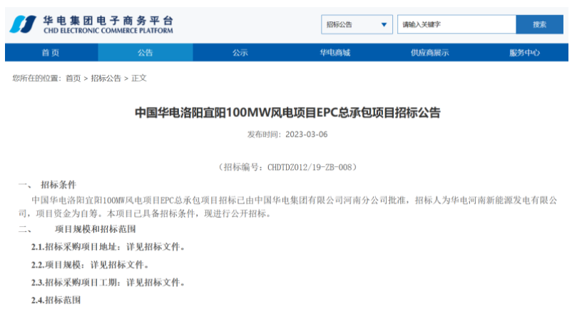 3月6日,華電集團電子商務平臺發(fā)布《中國華電洛陽宜陽100MW風電項目EPC總承包項目招標公告》。