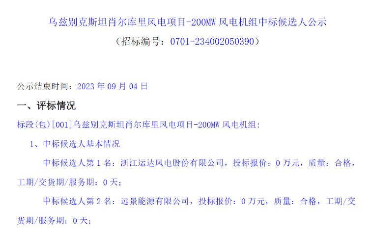 公告顯示,第一中標(biāo)候選人:浙江運(yùn)達(dá)風(fēng)電股份有限公司。第二中標(biāo)候選人:遠(yuǎn)景能源有限公司。第三中標(biāo)候選人:中車株洲電力機(jī)車研究所有限公司。