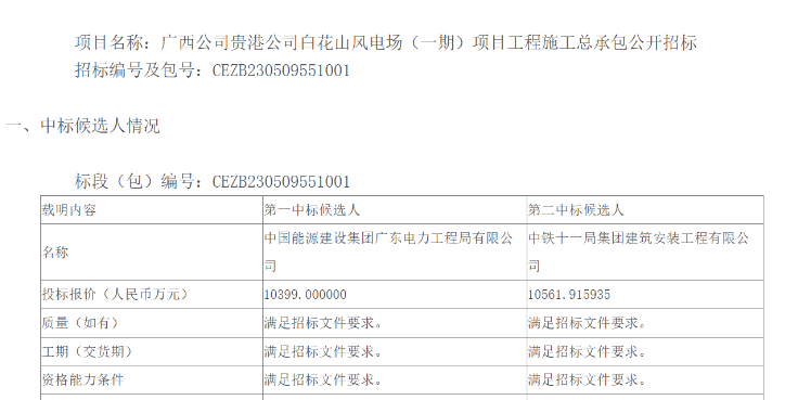 公告顯示,第一中標候選人:中國能源建設集團廣東電力工程局有限公司,投標報價:10399.000000萬元。第二中標候選人:鐵十一局集團建筑安裝工程有限公司,投標報價:10561.915935萬元。