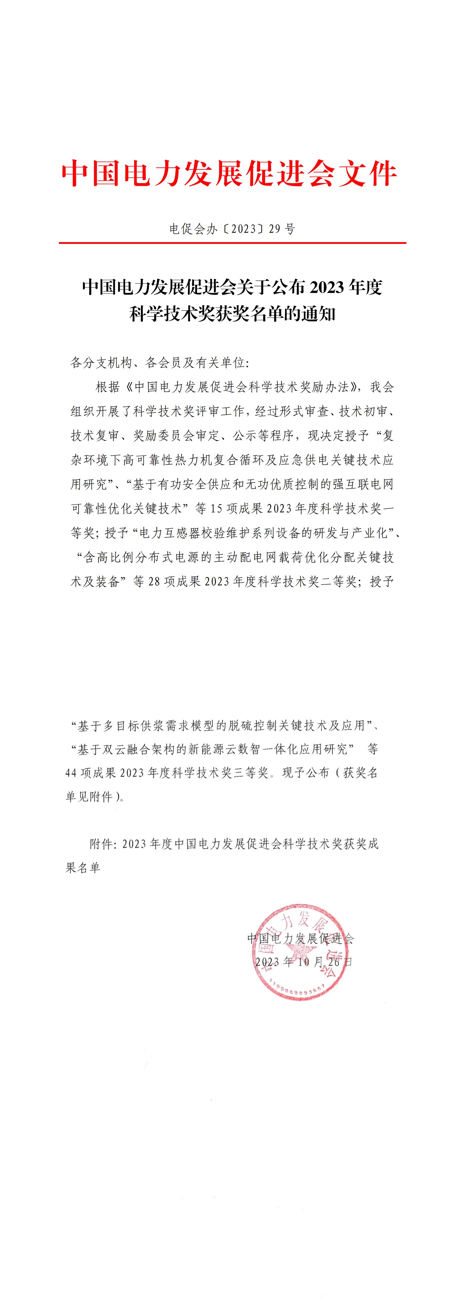 中國(guó)電力發(fā)展促進(jìn)會(huì)關(guān)于公布2023年度科學(xué)技術(shù)獎(jiǎng)獲獎(jiǎng)名單的通知