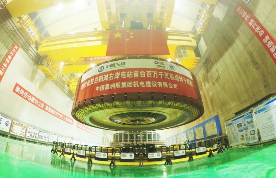 白鶴灘右岸電站首臺(tái)百萬(wàn)千瓦機(jī)組轉(zhuǎn)子吊裝