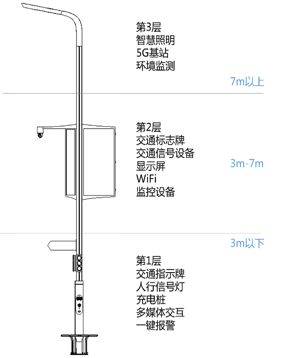 中電啟明星所開發(fā)的智慧路燈主要采用模塊化分層級的桿體設(shè)計,將路燈桿體分為頂部(>7米)、中部(3-7米)、下部(<3米)三個層次: