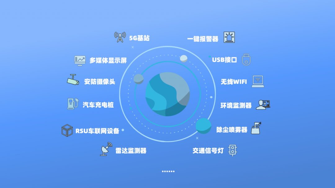 在不同高位層次里規(guī)劃部署相應(yīng)的智能化設(shè)備,包括但不限于5G基站、多媒體顯示屏、安防攝像頭、交通信號燈、充電樁、一鍵呼叫等數(shù)十類設(shè)備。每一層次里的設(shè)備都可靈活更換、拆卸;桿體內(nèi)匹配相應(yīng)的電容器和智能斷路器,在配電側(cè)整合強(qiáng)弱電機(jī)柜,安裝智能門鎖、溫度監(jiān)測,實行低壓供電,分級控制,充分滿足個性化的場景應(yīng)用需求。