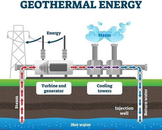 具體操作時,高溫地?zé)猁}水從地表下長達一英里或更深的儲層中回收。鹽水通過水井上升到地?zé)岚l(fā)電廠,鹽水通過閃蒸產(chǎn)生蒸汽,蒸汽帶動渦輪機旋轉(zhuǎn)發(fā)電。冷卻后的鹽水通過注水井回到同一儲層,在那里重新加熱并重復(fù)使用。