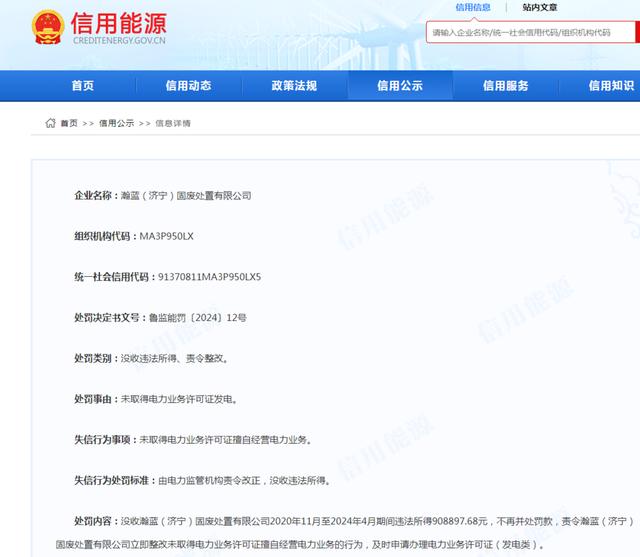 日前,信用能源公布了對瀚藍(lán)(濟(jì)寧)固廢處置有限公司的行政處罰決定,魯監(jiān)能罰〔2024〕12號處罰決定書文號顯示,瀚藍(lán)(濟(jì)寧)固廢處置有限公司未取得電力業(yè)務(wù)許可證發(fā)電。山東能源監(jiān)管辦沒收瀚藍(lán)(濟(jì)寧)固廢處置有限公司2020年11月至2024年4月期間違法所得908897.68元,不再并處罰款,責(zé)令瀚藍(lán)(濟(jì)寧)固廢處置有限公司立即整改未取得電力業(yè)務(wù)許可證擅自經(jīng)營電力業(yè)務(wù)的行為,及時申請辦理電力業(yè)務(wù)許可證(發(fā)電類)。