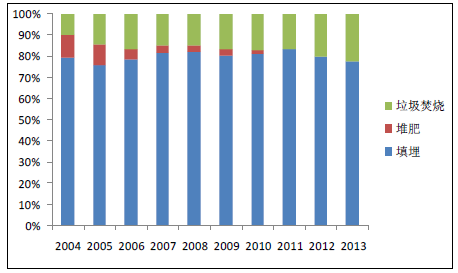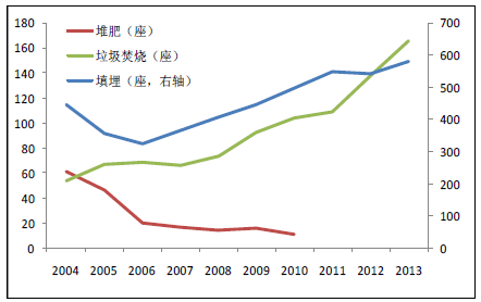 垃圾焚燒可以快速處理堆積成山的垃圾,有效減小垃圾的體積50%-90%,同時通過焚燒發(fā)電, 既解決了垃圾填埋的占地、污染問題,又實現(xiàn)了能源的清潔回收利用。目前,我國城市生活垃圾累積堆存量已達(dá)70 億噸,據(jù)國家統(tǒng)計局?jǐn)?shù)據(jù)顯示,截止2013 年我國生活垃圾填埋比例占68.2%, 垃圾焚燒僅占30.1%。