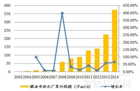 市政大規(guī)模MBR應(yīng)用和膜法市政水廠規(guī)模變化與膜法水處理行業(yè)產(chǎn)值變化趨勢高度一致