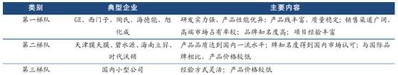 國內(nèi)膜法水處理行業(yè)公司可劃分為國際領(lǐng)先企業(yè),國內(nèi)領(lǐng)先企業(yè)和國內(nèi)小型企業(yè)三個(gè)梯隊(duì)