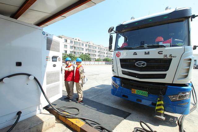 國(guó)網(wǎng)江蘇電力員工為江蘇永鋼集團(tuán)有限公司電動(dòng)重卡檢查充電樁。