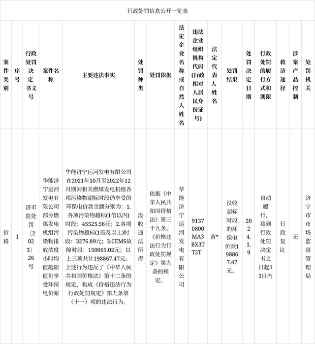 山東濟(jì)寧市市場(chǎng)監(jiān)督管理局近日對(duì)華能濟(jì)寧運(yùn)河發(fā)電有限公司部分燃煤發(fā)電機(jī)組污染物排放濃度小時(shí)均值超限值仍享受環(huán)保電價(jià)依法作出沒(méi)收超標(biāo)時(shí)段的環(huán)保電價(jià)款198867.47元的行政處罰,信息如下表: