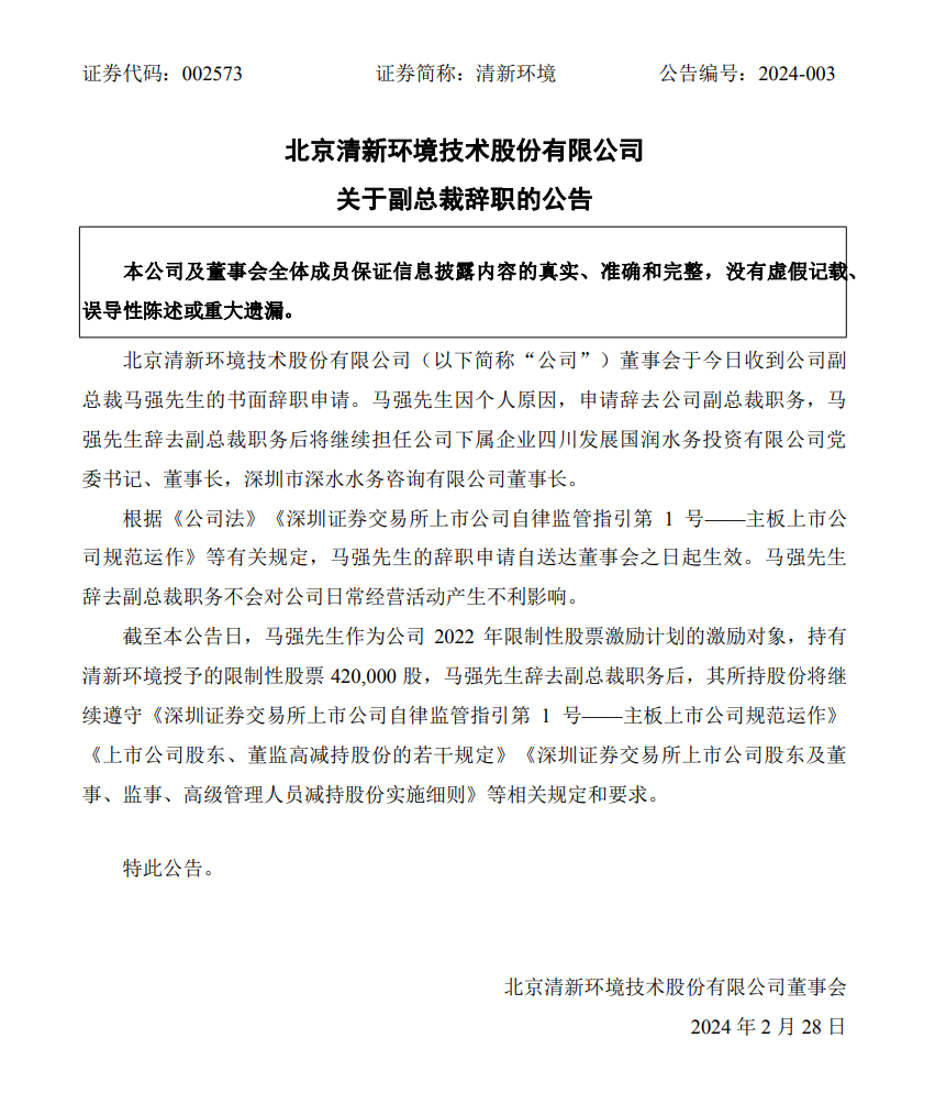 2月28日,清新環(huán)境發(fā)布公告稱,公司董事會于當日收到公司副總裁馬強先生的書面辭職申請。馬強先生因個人原因,申請辭去公司副總裁職務,馬強先生辭去副總裁職務后將繼續(xù)擔任公司下屬企業(yè)四川發(fā)展國潤水務投資有限公司黨委書記、董事長,深圳市深水水務咨詢有限公司董事長。