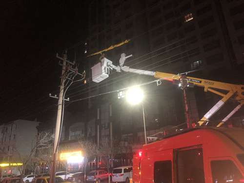 在應(yīng)急搶修燈的照明下,絕緣斗臂車絕緣臂緩緩升起,作業(yè)人員緩緩向作業(yè)點(diǎn)靠近,由于是夜間帶電搶修,作業(yè)能見(jiàn)度等條件較為不足,工作負(fù)責(zé)人不敢有一絲大意,嚴(yán)密監(jiān)護(hù)作業(yè)人員的行為。兩名帶電作業(yè)操作人員站在10多米高空的作業(yè)斗內(nèi),小心翼翼的包絕緣毯,套絕緣管,更換燒壞的熔斷器……一道道作業(yè)流程嚴(yán)謹(jǐn)有序,經(jīng)過(guò)3個(gè)半小時(shí)的連續(xù)搶修,故障搶修順利結(jié)束,受損線路恢復(fù)供電。