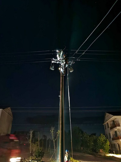事故發(fā)生后,龔坊供電所所長(zhǎng)楊程立即組織人員第一時(shí)間趕赴現(xiàn)場(chǎng),經(jīng)現(xiàn)場(chǎng)查勘后制定搶修方案,在確保人身安全的前提下,連夜開展搶修工作。在搶修現(xiàn)場(chǎng),做好安全措施后,樂安縣供電公司龔坊供電所10余名員工協(xié)同合作,對(duì)損毀的斷桿、導(dǎo)線、橫擔(dān)進(jìn)行清理,重新立桿、安裝新的拉線、T接導(dǎo)線……搶修工作有條不紊的進(jìn)行。