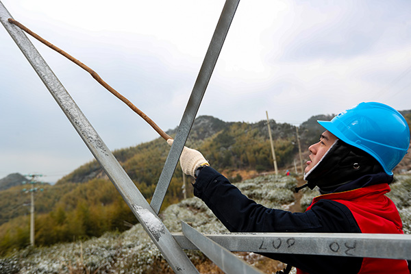 巡線員們一路踏冰前行,一路巡視線路和鐵塔,每到一基桿塔就利用望遠(yuǎn)鏡、測距儀等工具詳細(xì)監(jiān)測冰情,仔細(xì)觀察是否有安全隱患,并用手機(jī)拍攝下來,同時也對基礎(chǔ)、導(dǎo)地線、桿塔、金具絕緣子及接地裝置進(jìn)行了全面“問診”。如果遇到樹竹倒伏在線路上方位,還要現(xiàn)場進(jìn)行清理,以免影響線路的安全穩(wěn)定運(yùn)行。