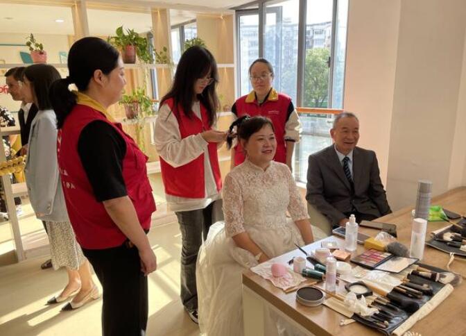 當(dāng)天,該分局青年志愿者早早來到拍攝場地布置背景墻。不一會(huì)兒,拍攝現(xiàn)場擠滿了前來照相的老人。活動(dòng)中,一旁的志愿者還會(huì)主動(dòng)上前為老人打理發(fā)型、幫忙整理服飾。“我們結(jié)婚五十多年了,從沒拍過婚紗照,今天在家門口實(shí)現(xiàn)了婚紗夢,彌補(bǔ)了我們的遺憾,真是太感謝你們了。”年邁的劉奶奶開心地對志愿者們說道。